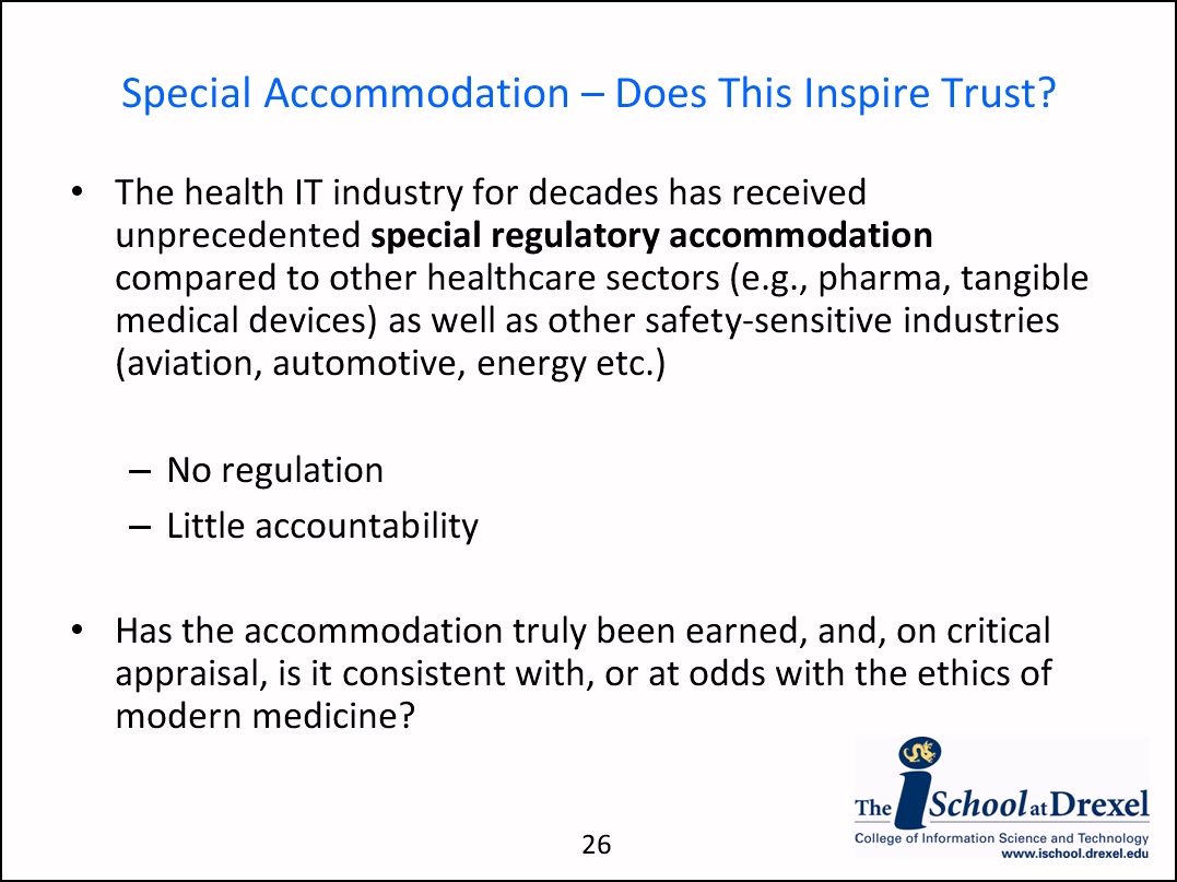 I suggested a simple solution: a paradigm shift in thinking about health IT as another medical device, that needed to be subject to the same methodologies and ethical considerations applicable for decades (or more) in the healthcare delivery sector such as medical devices, pharmaceuticals, and research (and other risk-prone industries e.g., aviation and automotive).